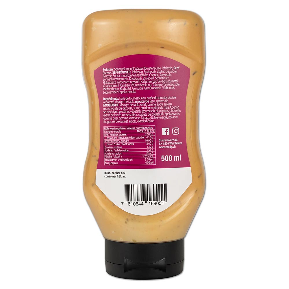 Sonnenblumenöl, Wasser, Tomatenpüree, Tafelessig, SENF, Glucose, Zucker, modifizierte Maisstärke, Cognac, Speisesalz, Sonnenblumenprotein, Knoblauch, Zwiebeln, Schnittlauch, HEFEextrakt, Konservierungsstoff: Kaliumsorbat; Verdickungsmittel: Guarkernmehl, Xanthan; Würzzubereitung: Tabasco; Gewürze, Gewürzextrakt / färbendes Lebensmittel Paprikaextrakt