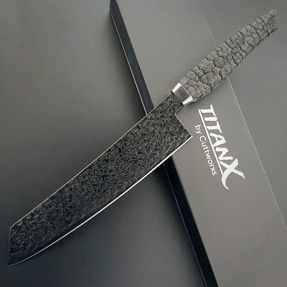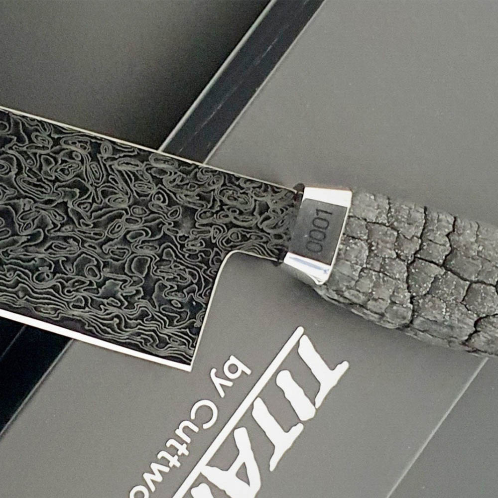 Die Klinge des titanX Black limited Evolution Damastmesser springt durch das besondere Design ins Auge. Schwarz und Silber sind die Merkmale des Messers. Die Klinge aus schwarzem Damast und der Griff aus Flamewood machen es einzigartig. Wie jedes Cuttworxs Messer liegt es optimal in der Hand und sorgt für den perfekten Schnitt.